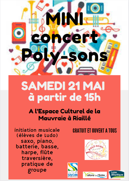 L’école de musique Poly-sons propose un concert le samedi 21 mai à 15h à l’Espace Culturel de la Mauvraie à Riaillé.