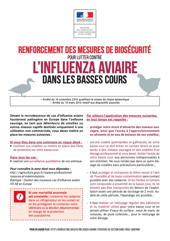 Dans ce contexte, il est obligatoire pour les particuliers de déclarer la détention d'oiseaux ou de volailles sur Mes démarcheset deprendre connaissance de la fiche d'informations sur les mesures de biosécurité.