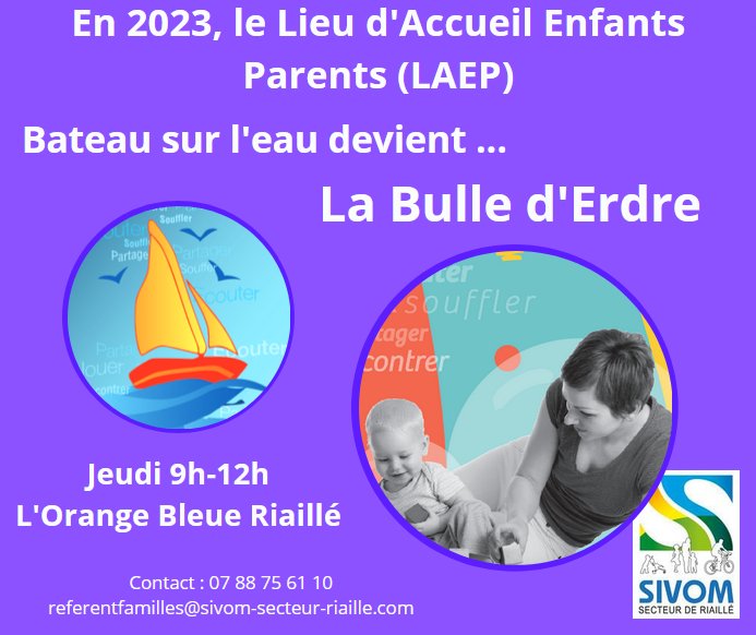 le Lieu d'Accueil Enfants Parents (LAEP) Bateau sur l'eau change de nom et devient la Bulle d'Erdre, il est maintenant géré par le SIVOM du Secteur de Riaillé.